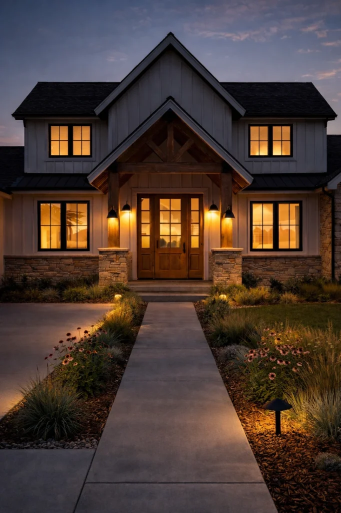 Exterior lighting inspired by barn fixtures is a hallmark of modern farmhouse exterior ideas. Gooseneck lights, lantern-style sconces, and matte black finishes add character while providing practical illumination.