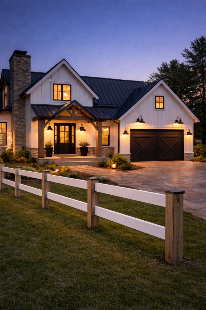 Horizontal slat fences or classic post-and-rail designs work well. They complement the farmhouse style while maintaining openness. Minimalist fencing enhances curb appeal and frames the home beautifully.