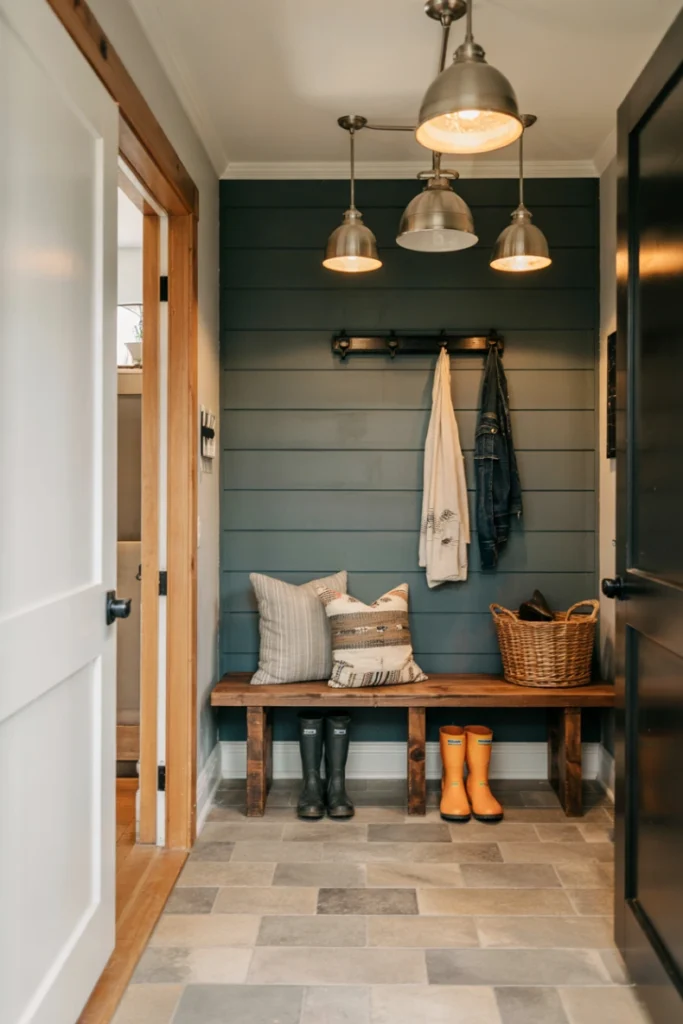 Accent walls add personality and visual interest to mudrooms. Painted panels, wallpaper, or textured finishes create focal points without overwhelming the space.