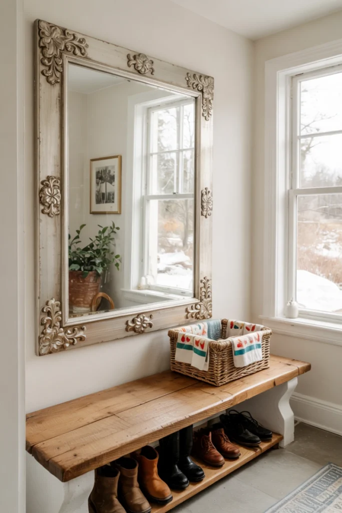 Mirrors serve both practical and decorative purposes in mudrooms. They allow quick appearance checks before leaving the house and visually expand smaller spaces.