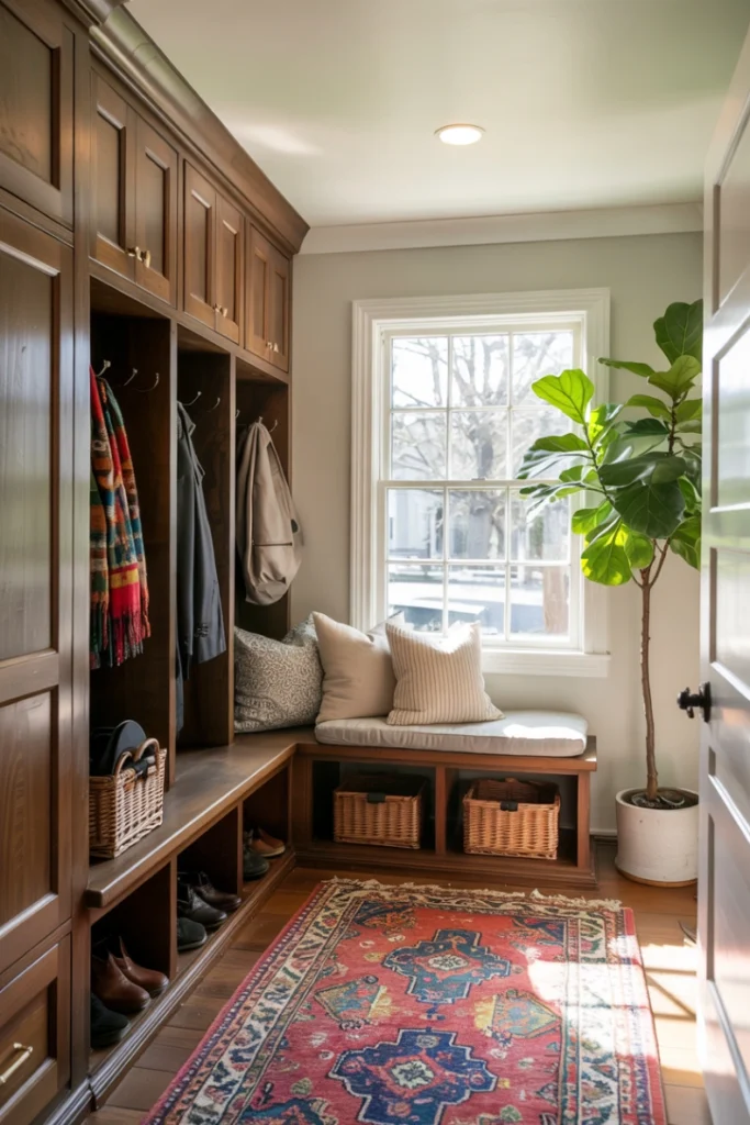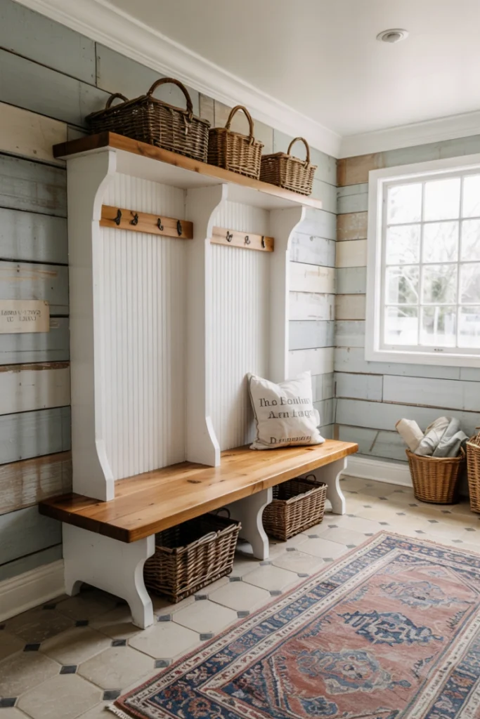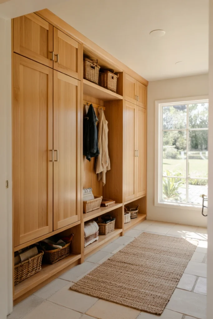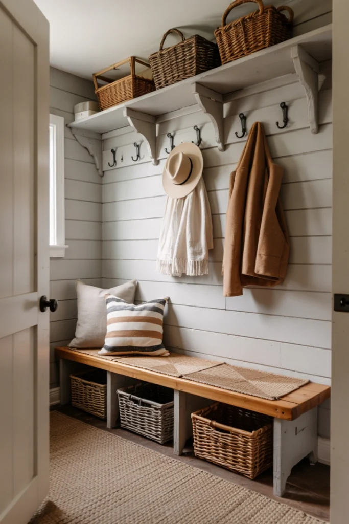 Natural or woven baskets add warmth and texture. As Mudroom Design Ideas suggest, baskets combine practicality with visual appeal.