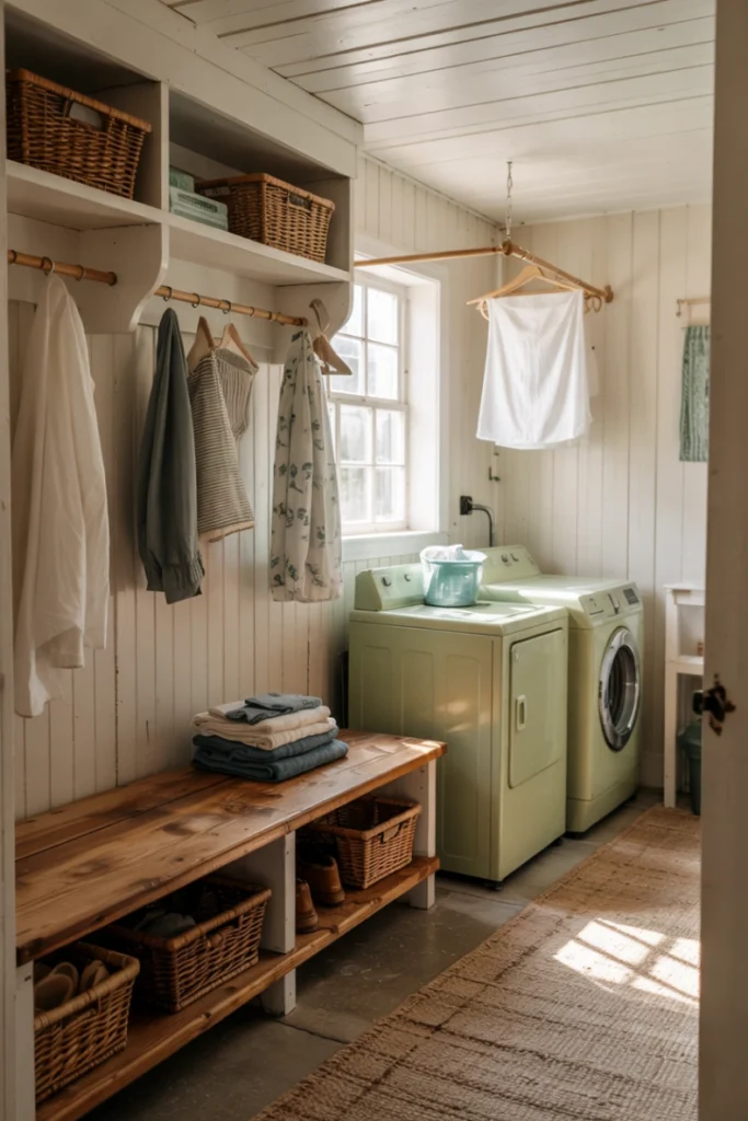 Combining mudrooms with laundry areas maximizes efficiency. Shared storage and surfaces streamline daily chores while saving space.