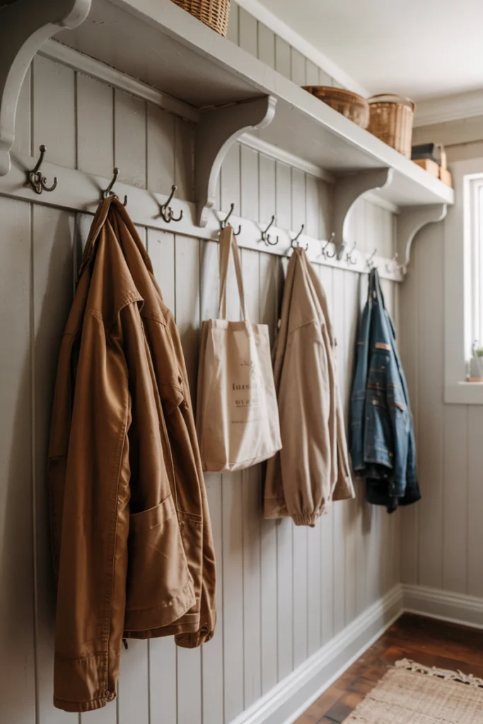 Wall hooks are one of the simplest yet most effective mudroom additions. They allow coats, bags, and scarves to be hung quickly, preventing items from piling up on floors or furniture. Hooks are especially useful in compact entryways where space is limited.