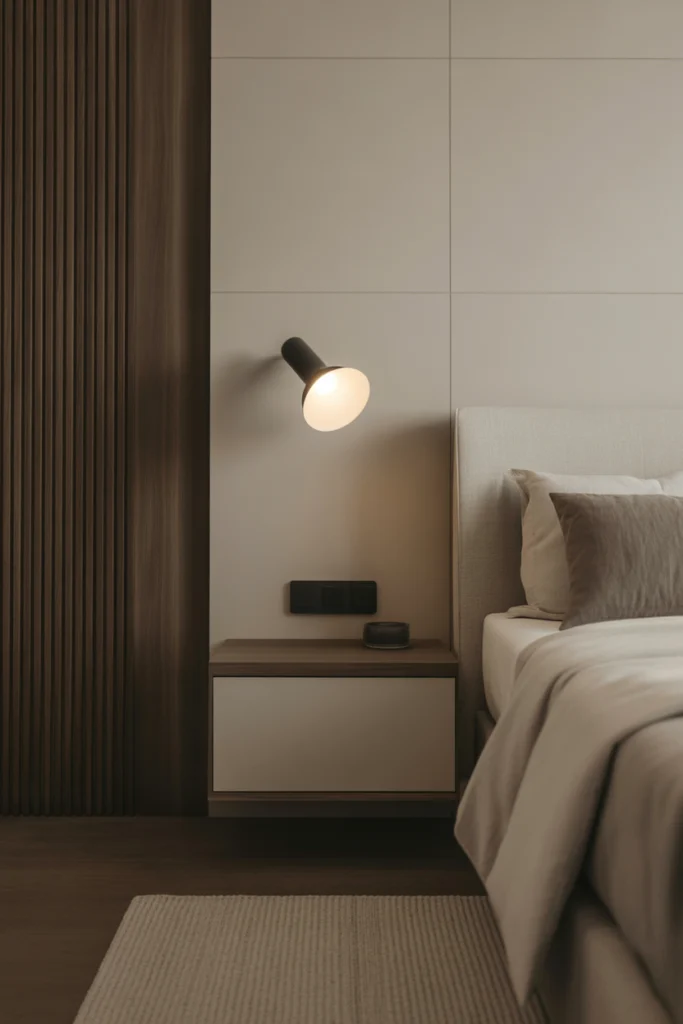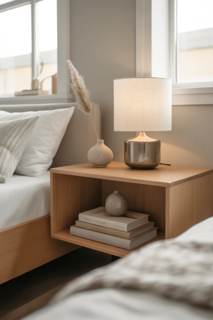 This nightstand idea for 2026 works well in contemporary and small bedrooms. Paired with compact lighting and minimal décor, floating shelves create a clean and modern bedside look.