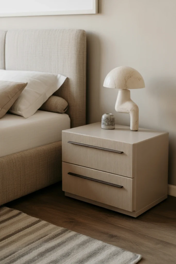 Textured nightstands add depth and tactile interest to bedroom décor. Wood grain, ribbed panels, or matte surfaces enhance visual appeal.