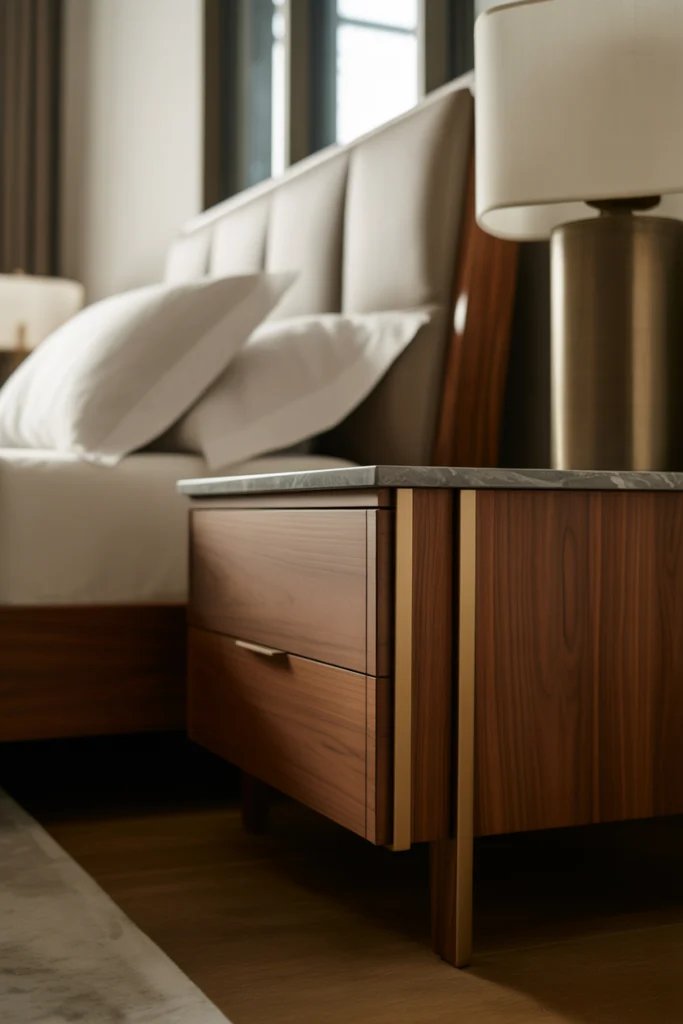 Metal-accented nightstands introduce contrast and sophistication. Black, gold, or brass details add visual interest to modern bedrooms.