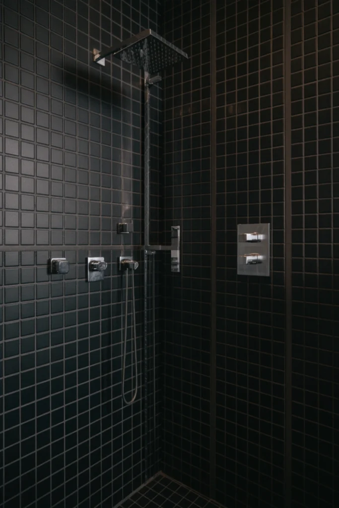 High-contrast palettes add drama to no door showers. Black and white combinations emphasize architectural lines.