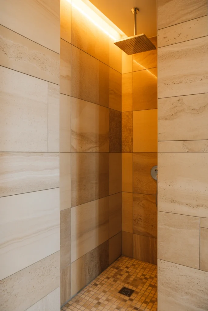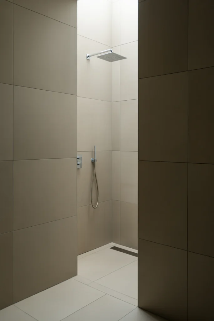 Linear drains improve drainage performance and allow for larger tile formats. Among no door shower ideas, linear drainage enhances both aesthetics and function.