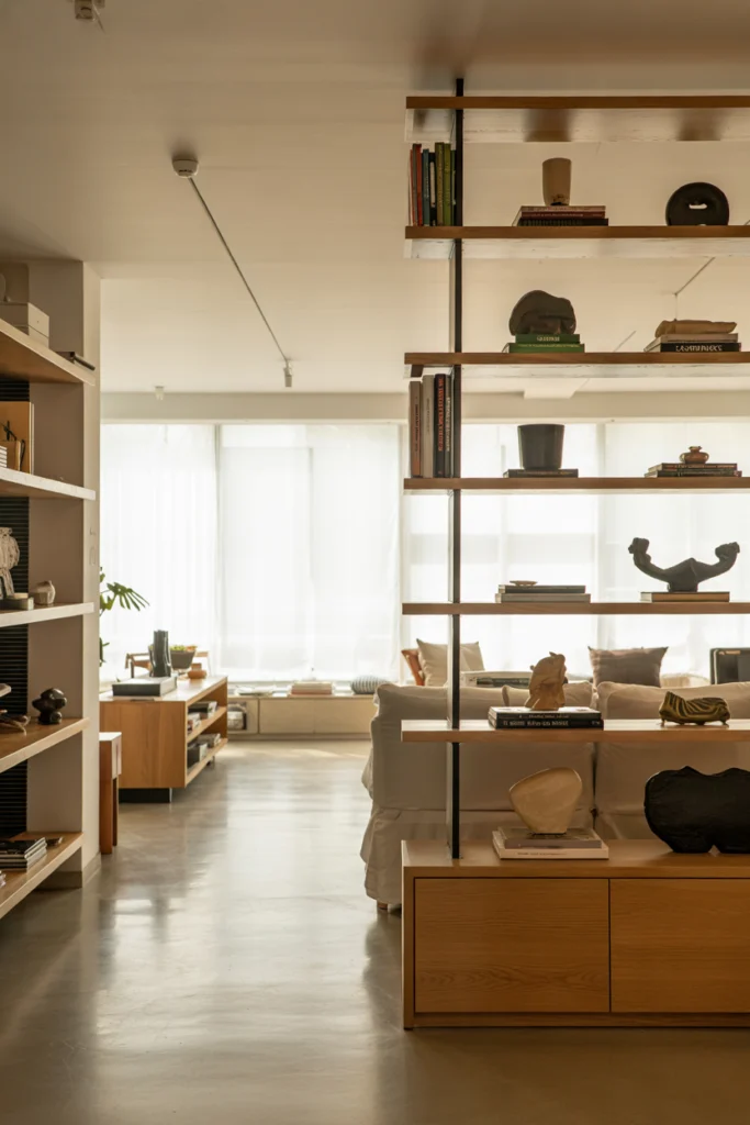Visual dividers like shelving units or glass panels provide separation without walls. This open floor plan idea balances openness and privacy.