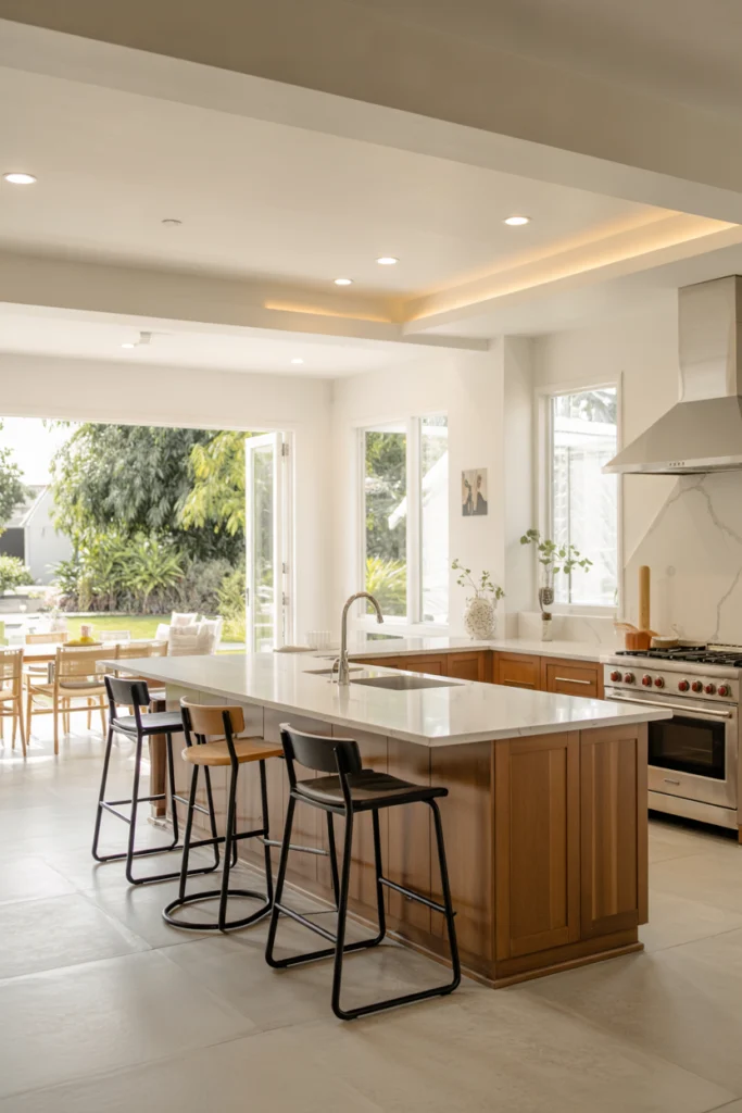 From a layout standpoint, the island enhances functionality without closing off the space. It encourages interaction and improves traffic flow. Choosing complementary materials ensures the island blends seamlessly with the rest of the open layout.