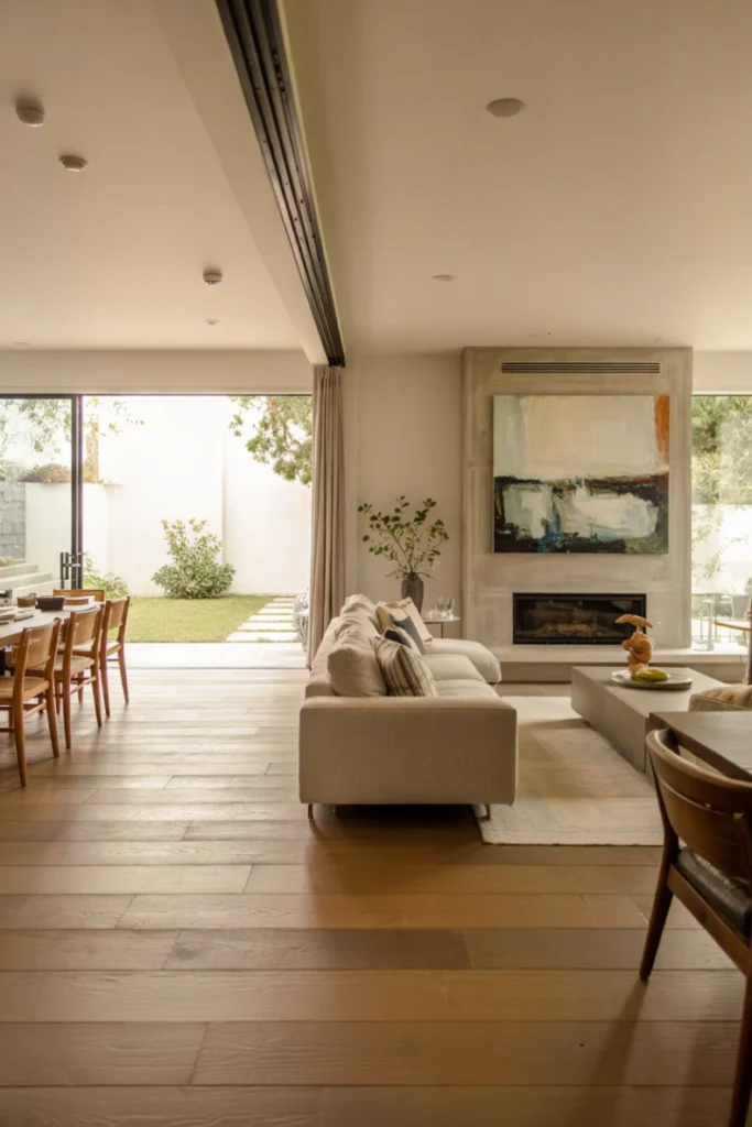 From a functional standpoint, dining integration improves circulation and usability. Strategic lighting and furniture placement help define the dining zone while preserving openness. This layout supports both casual meals and formal gatherings.