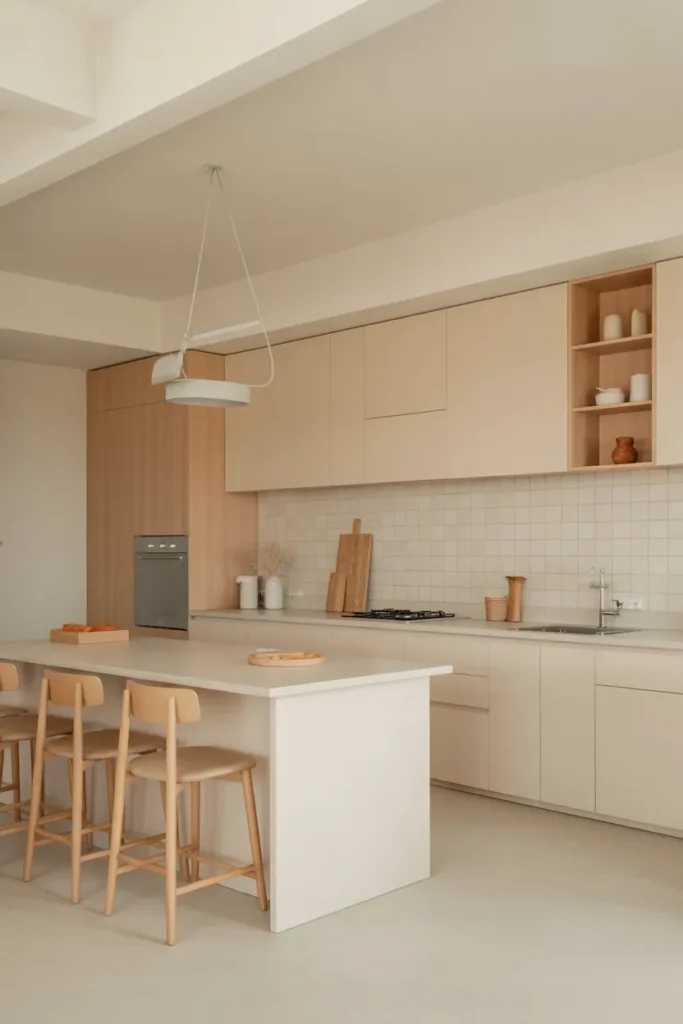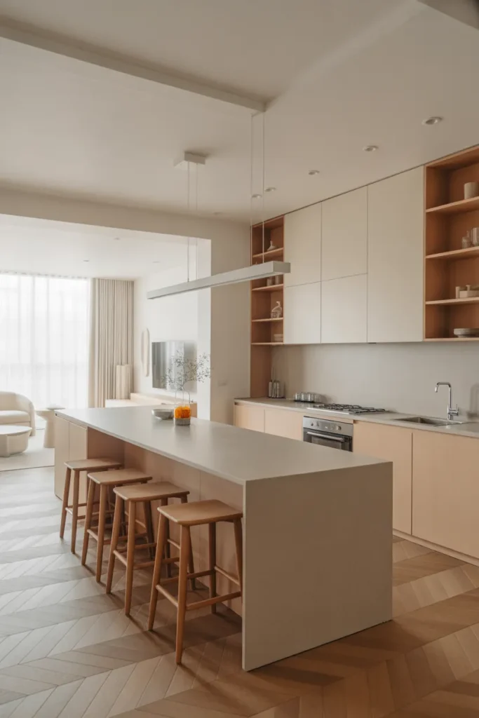 Neutral tones create a peaceful and cohesive atmosphere in an open kitchen. Shades like beige, white, taupe, and soft gray make the space feel light and harmonious. These colors also blend effortlessly with living and dining areas, allowing the entire room to feel unified.