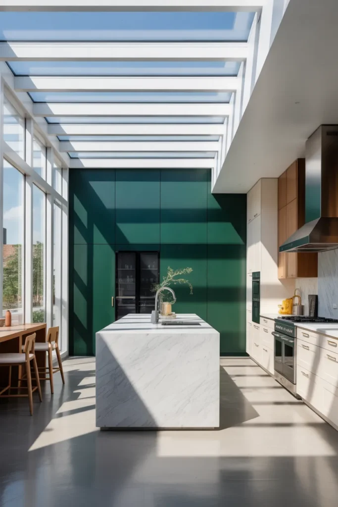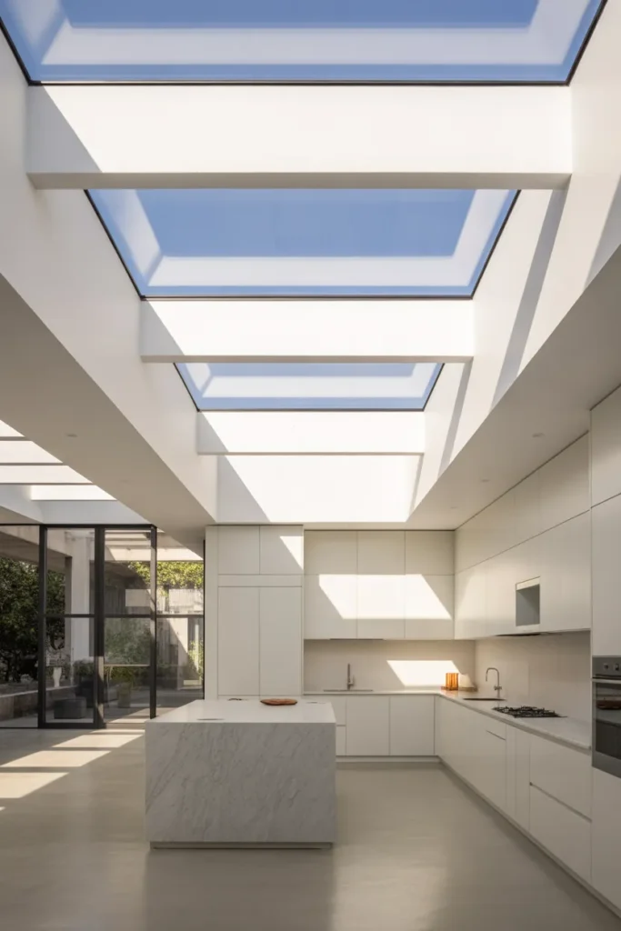 Skylights also enhance the sense of openness by creating a connection with the outdoors. They highlight countertops, cabinet finishes, and kitchen textures. When paired with light-colored interiors, this design creates a spacious and uplifting atmosphere.