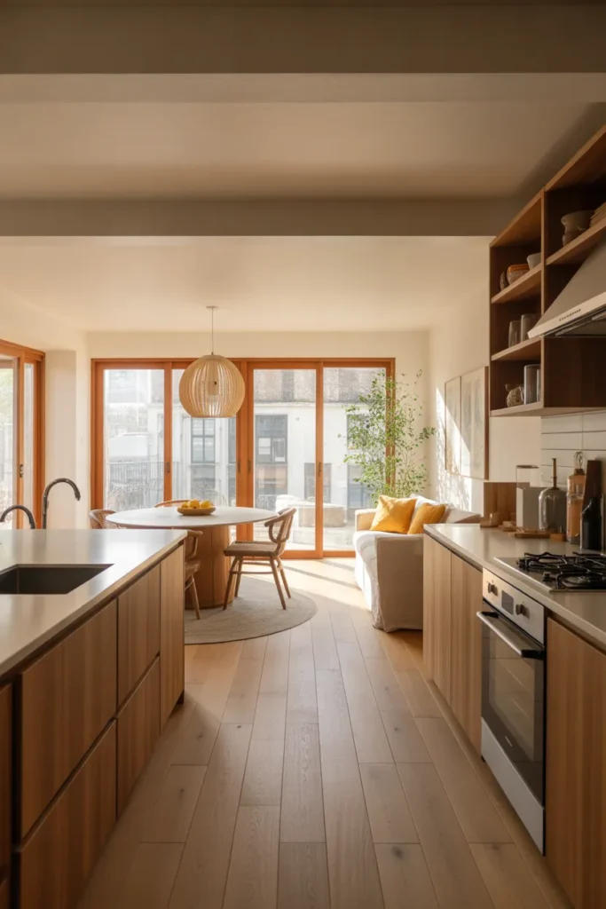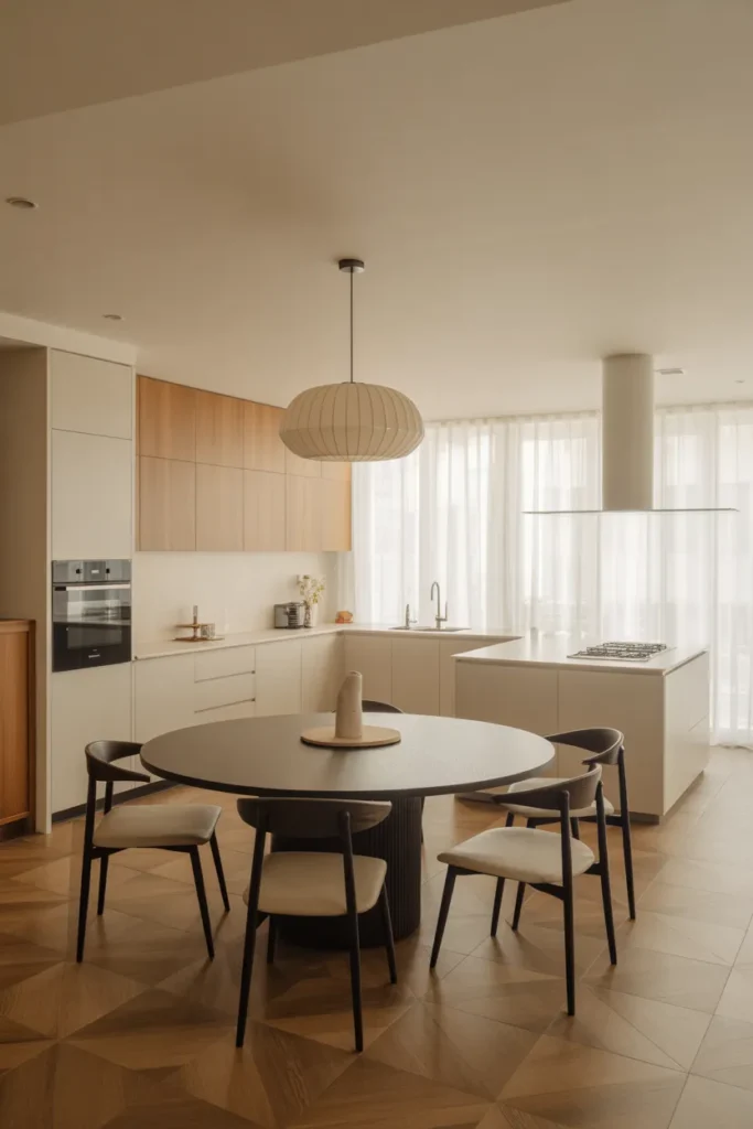 An integrated dining area can be designed with a built-in bench, round table, or extended island. Choose furniture that complements your kitchen materials for a cohesive look. This setup enhances the open feel of the room while making it more practical and welcoming.