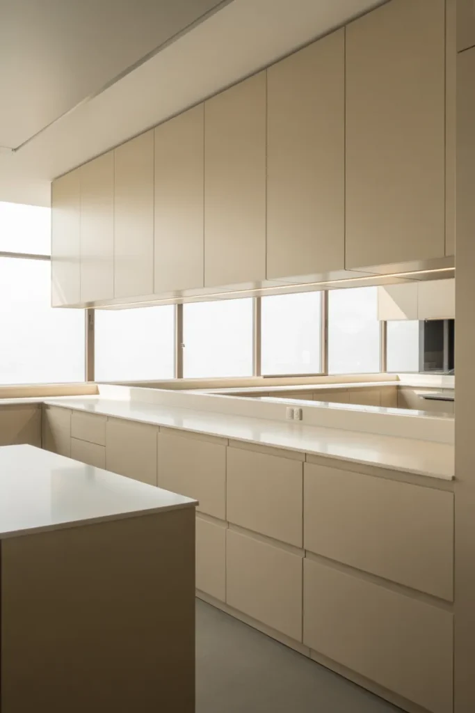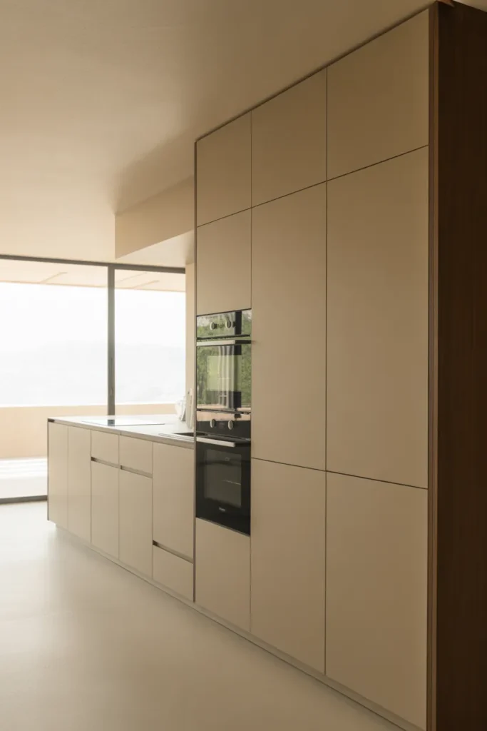 This design works well in homes that prefer a minimalist aesthetic. The seamless cabinetry makes the kitchen feel like an integrated part of the room rather than a separate zone. Pair with neutral colors and soft lighting for the best effect.