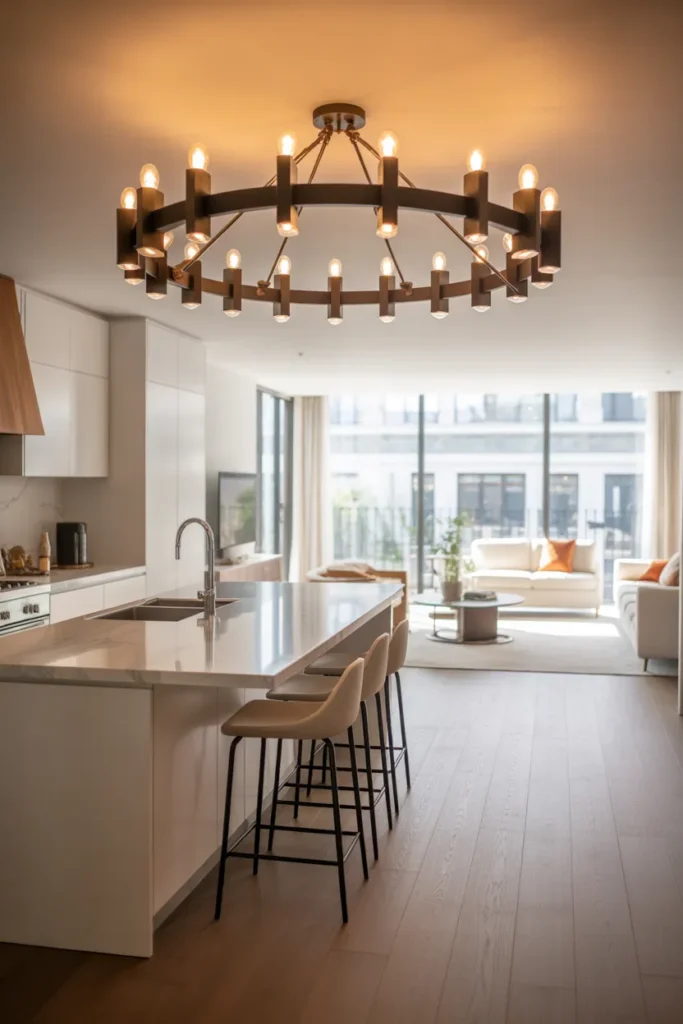 Statement lighting also defines the kitchen area without adding physical barriers. It enhances both style and function, providing ambient lighting that improves the overall atmosphere. Pair it with understated cabinetry and neutral tones to let the lighting stand out.