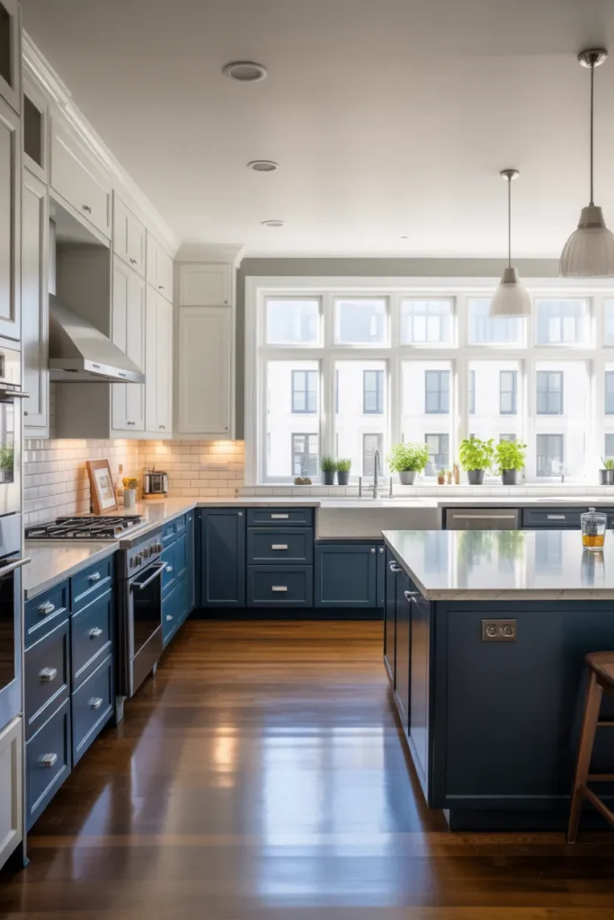Choose shades that complement your decor, such as dark lower cabinets with light uppers or warm wood paired with cool neutrals. This approach gives your kitchen a designer feel while keeping the space visually open and balanced.