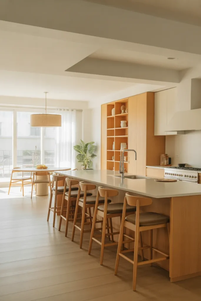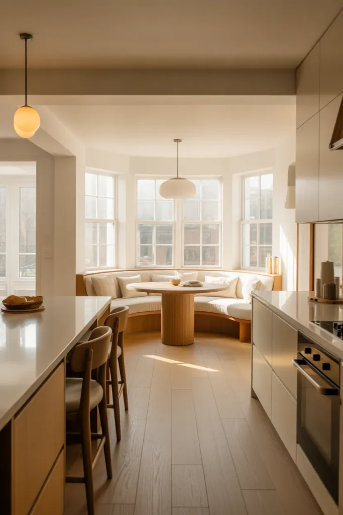 Built-in seating also adds architectural interest and can be customized with storage underneath. Use upholstery and cushions that match your kitchen palette for a cohesive design. This layout keeps the flow open while adding practical functionality.