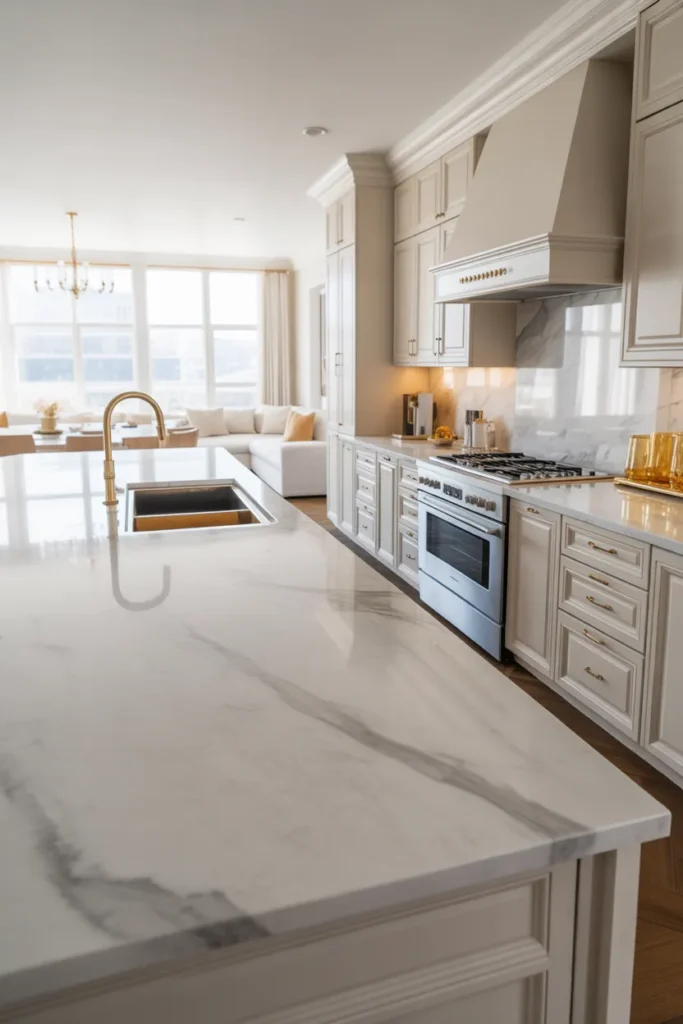Marble pairs well with neutral tones, wood cabinetry, and metallic accents. It also reflects light beautifully, making the kitchen feel brighter and more open. This material is perfect for homeowners seeking a sophisticated yet modern atmosphere.