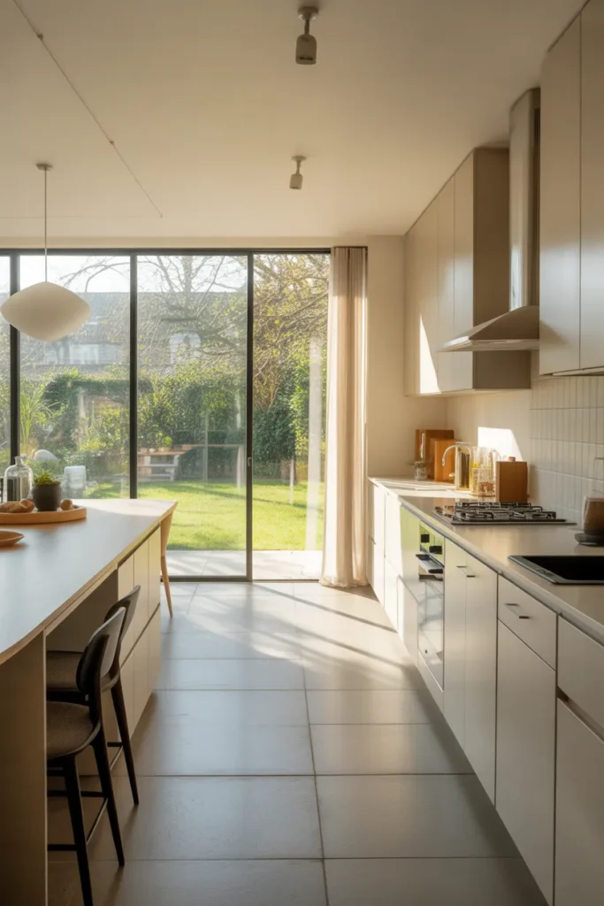 If your kitchen faces a garden or terrace, these windows create a direct visual link that enhances the overall ambiance. Combine this feature with a simple color scheme to keep the room bright and balanced. The natural light will highlight textures, finishes, and architectural details, making the space feel luxurious and inviting.