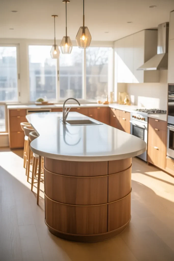 A curved island adds a unique and stylish touch to an open kitchen. The rounded edges create a softer, more inviting look compared to traditional rectangular islands. This shape also improves movement around the kitchen, making it more comfortable and functional.