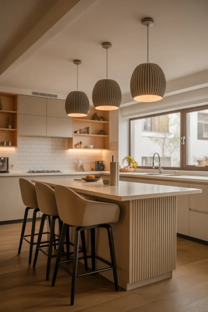 Choose lights that match your kitchen’s style, whether modern, industrial, or classic. Pendant lights also create warm ambient lighting, making the space feel cozy and inviting in the evenings. When paired with recessed lighting or under-cabinet lights, they contribute to a fully balanced lighting scheme.