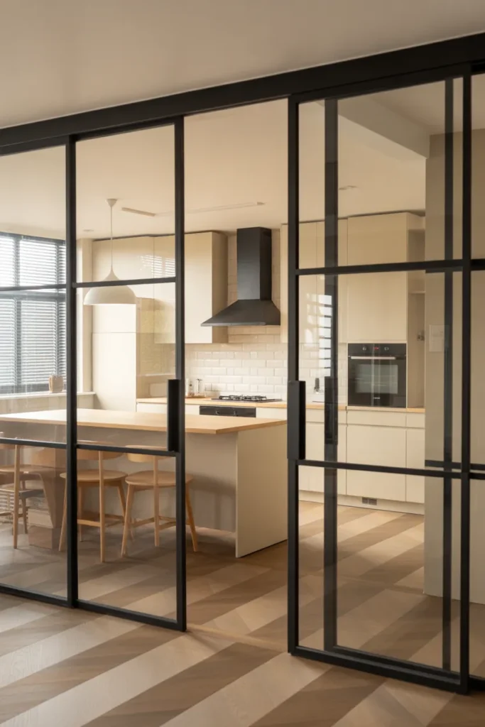 Glass partitions offer a stylish way to separate the kitchen while maintaining the openness of the design. They allow light to pass through and keep the visual connection between spaces intact. This is especially useful if you want to reduce noise or cooking smells without using solid walls.