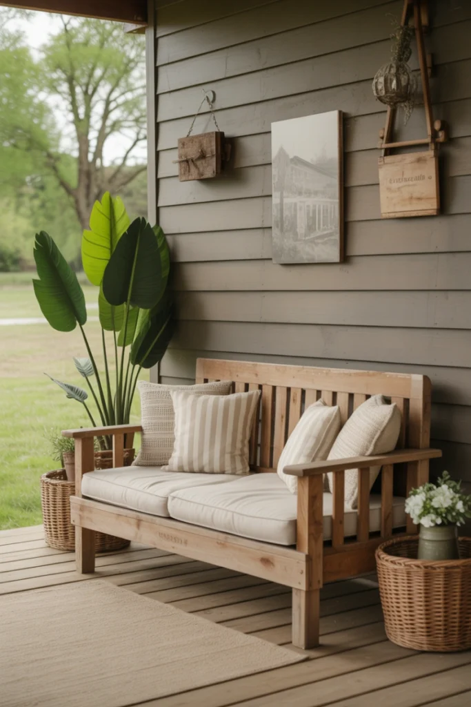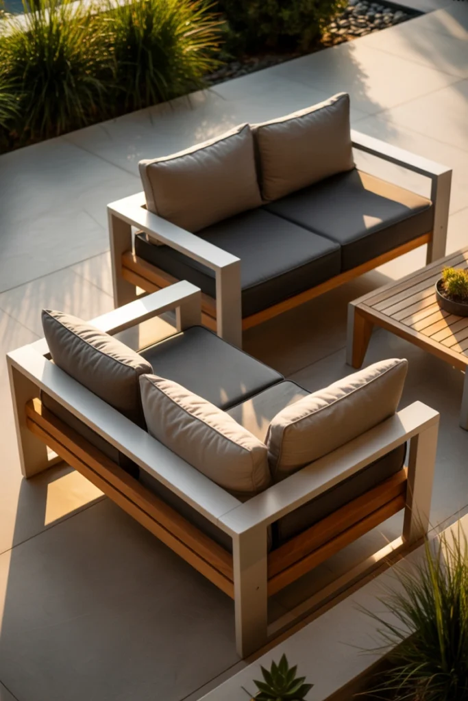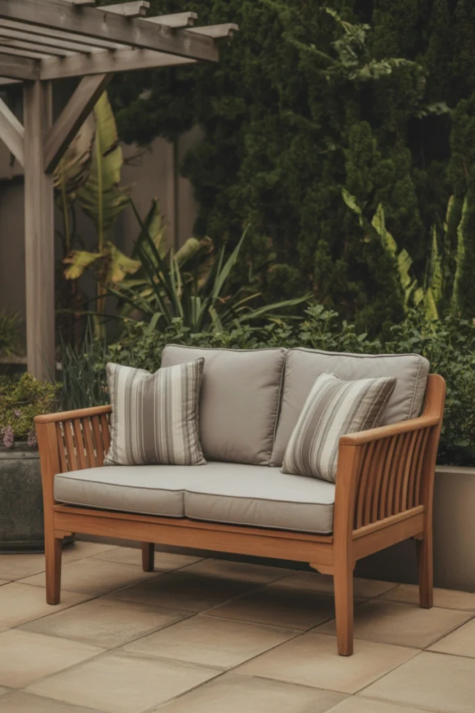 Adding plaid or textured cushions enhances the farmhouse aesthetic while providing comfort. This style works beautifully alongside lanterns, wooden planters, and natural stone elements. A rustic outdoor loveseat is perfect for those who love relaxed, welcoming outdoor environments with a touch of nostalgia.