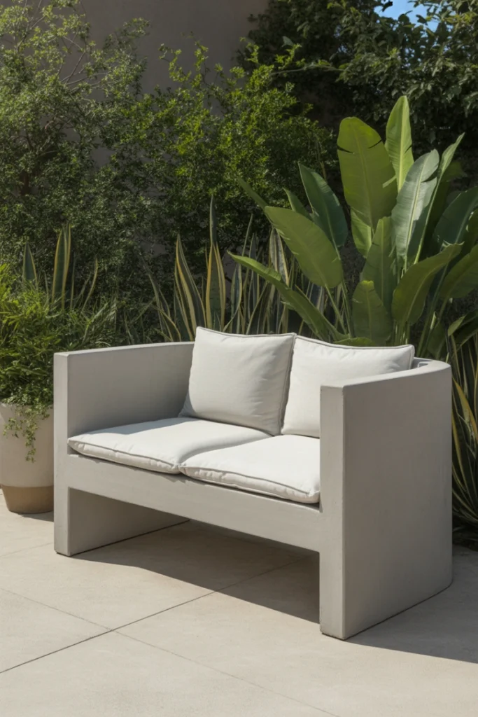 To balance the hardness of concrete, add plush cushions or seat pads. This contrast creates a visually striking yet comfortable seating solution. Concrete loveseats work particularly well in contemporary gardens and architectural outdoor designs.