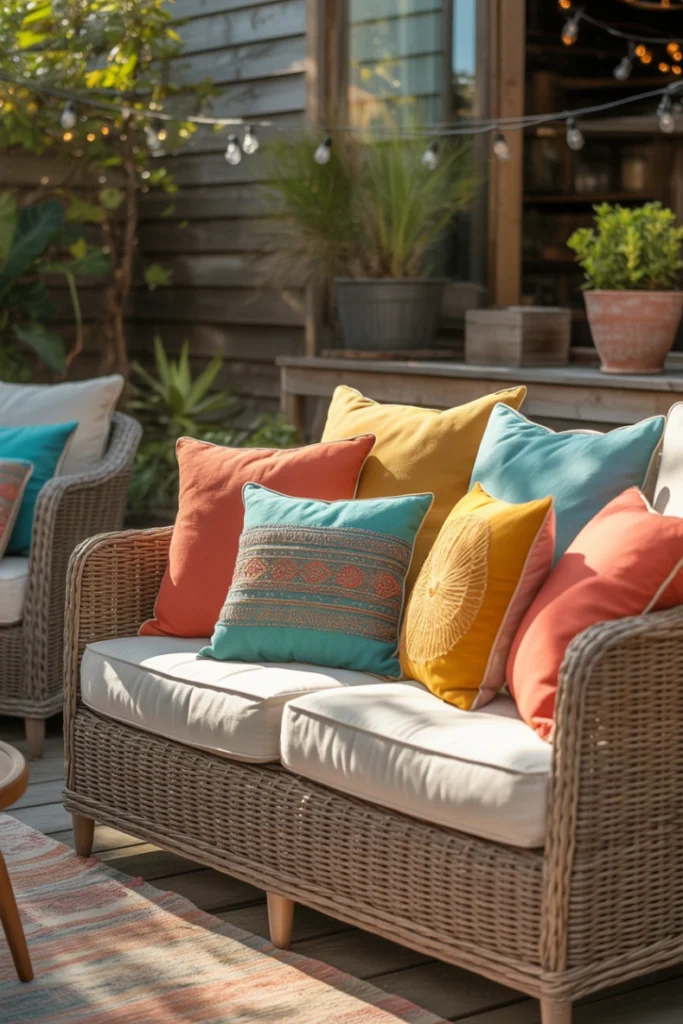 Adding throw pillows instantly elevates any outdoor loveseat. This idea focuses on personalization and comfort by layering textures, colors, and patterns. Throw pillows allow you to refresh your outdoor décor seasonally without changing the furniture.