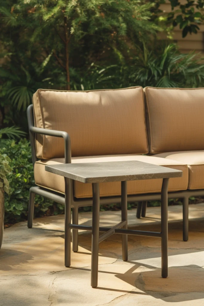 An outdoor loveseat paired with an integrated or matching side table enhances functionality. This setup provides a convenient surface for drinks, books, or décor items. It’s perfect for patios designed for relaxation and socializing.