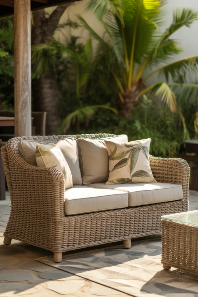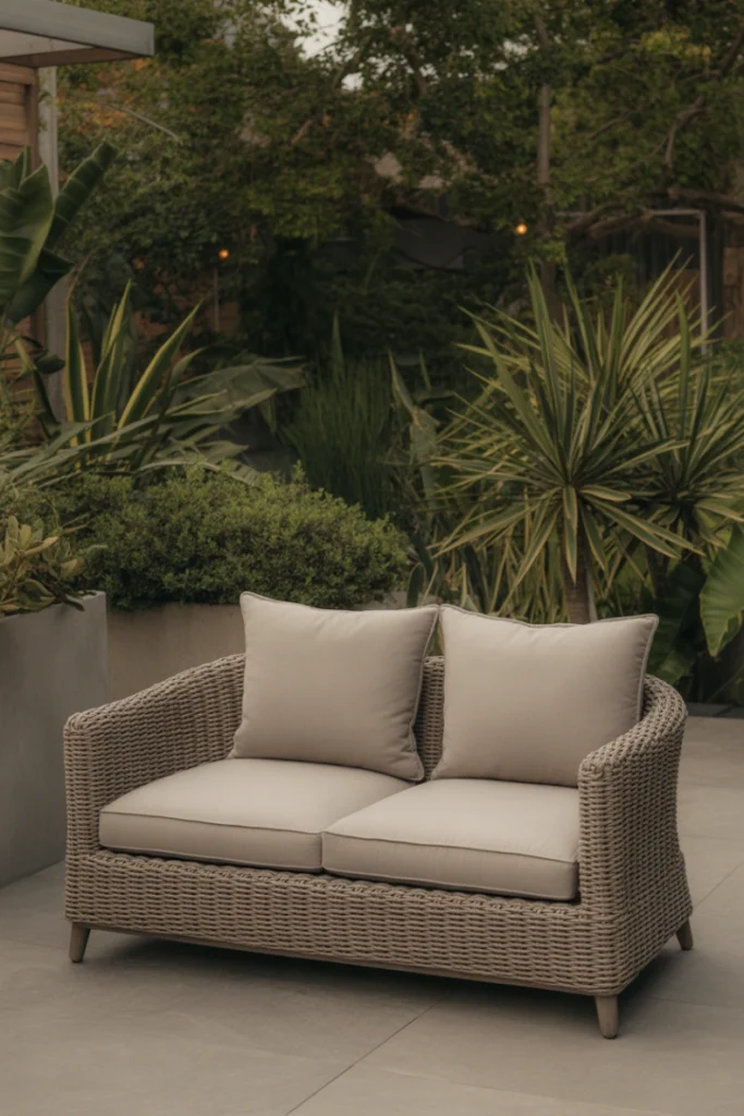 Wicker outdoor loveseat ideas remain a popular choice due to their relaxed and inviting appearance. Synthetic resin wicker is especially well-suited for outdoor use because it resists moisture, fading, and cracking. These loveseats bring a casual, resort-like feel to patios and poolside areas.