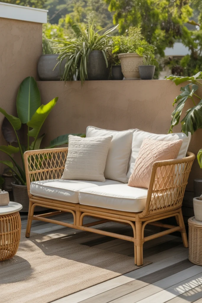 Outdoor loveseat ideas with decorative pillows work well in casual and eclectic spaces. Choose weather-resistant fabrics to maintain durability. This approach is budget-friendly and perfect for homeowners who enjoy updating their outdoor style regularly.