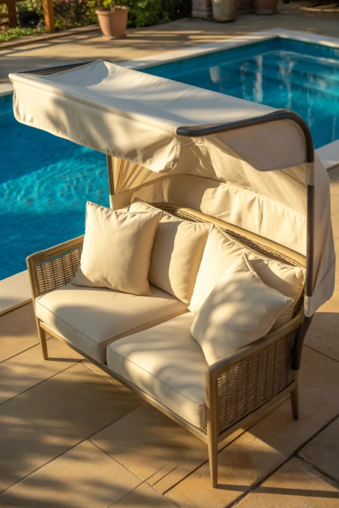 These loveseat ideas are perfect for poolside lounges and open patios. The added shade enhances comfort, making it easier to relax outdoors for longer periods. Choose UV-resistant fabric for durability and long-term use.