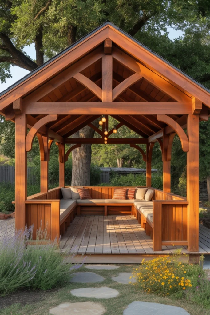 Built-in seating is a smart way to maximize space and functionality within a pavilion. This idea works particularly well for smaller backyards where efficiency matters. Built-in benches or sectional seating provide ample room for guests while maintaining a clean and cohesive design.
