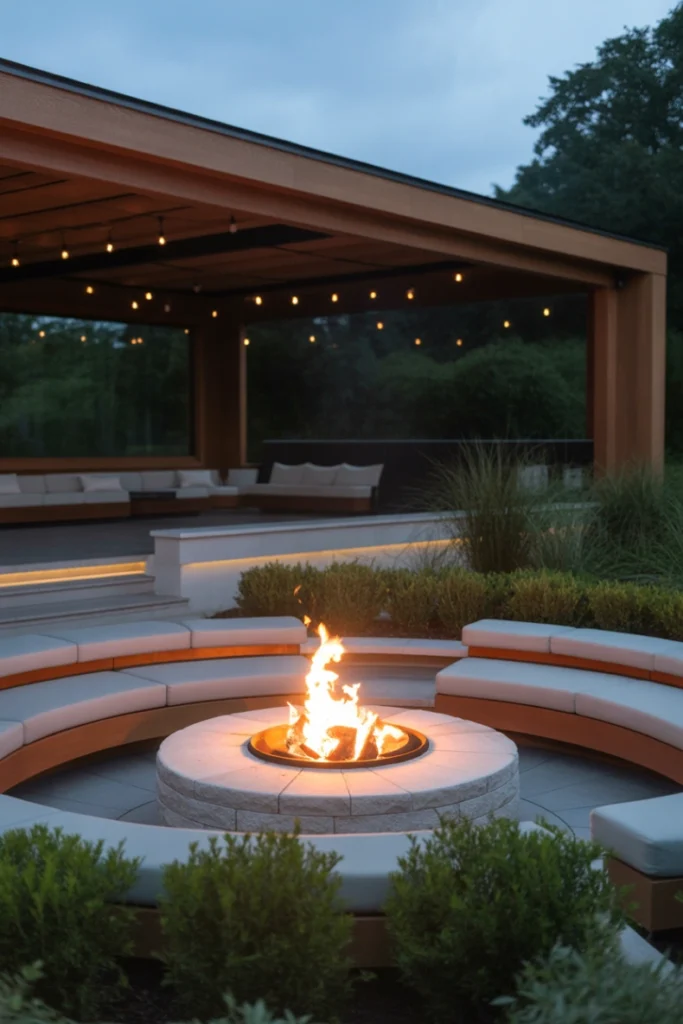 Safety and ventilation are key considerations, so open layouts work best. Surrounding the fire pit with comfortable seating encourages conversation and relaxation. This is one of the most inviting outdoor pavilion ideas for homeowners seeking extended outdoor use.
