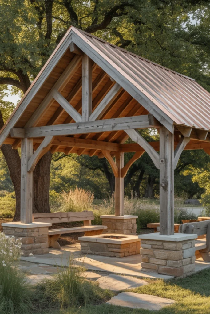Rustic pavilions emphasize natural materials and textures, creating a cozy and inviting outdoor atmosphere. Wood, stone, and exposed beams define this style, making it one of the most charming outdoor pavilion ideas for nature-inspired landscapes.
