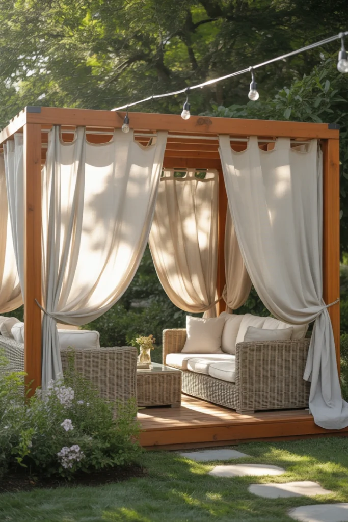 Curtains made from outdoor-rated fabrics or decorative screens enhance both function and aesthetics. They can be opened or closed as needed, adapting to different occasions. Among outdoor pavilion ideas, this option offers flexibility without sacrificing style or airflow.