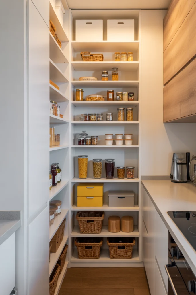 Vertical shelving is a smart solution for narrow pantries or tight kitchen layouts. By focusing on height rather than width, vertical shelves provide ample storage without taking up valuable floor space. This approach is ideal for apartment kitchens or compact homes.