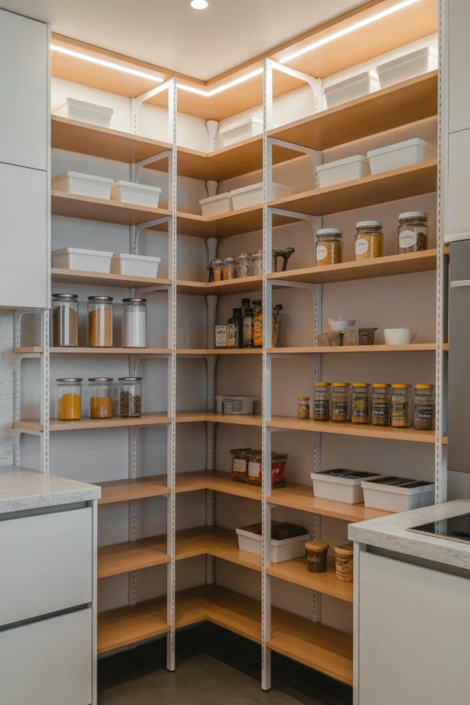 From a design perspective, corner shelving creates a smooth flow within the pantry layout. Lazy Susan shelves or angled tiers can improve visibility and accessibility while maintaining a clean look. These pantry shelving ideas are perfect for maximizing space without compromising style or convenience.