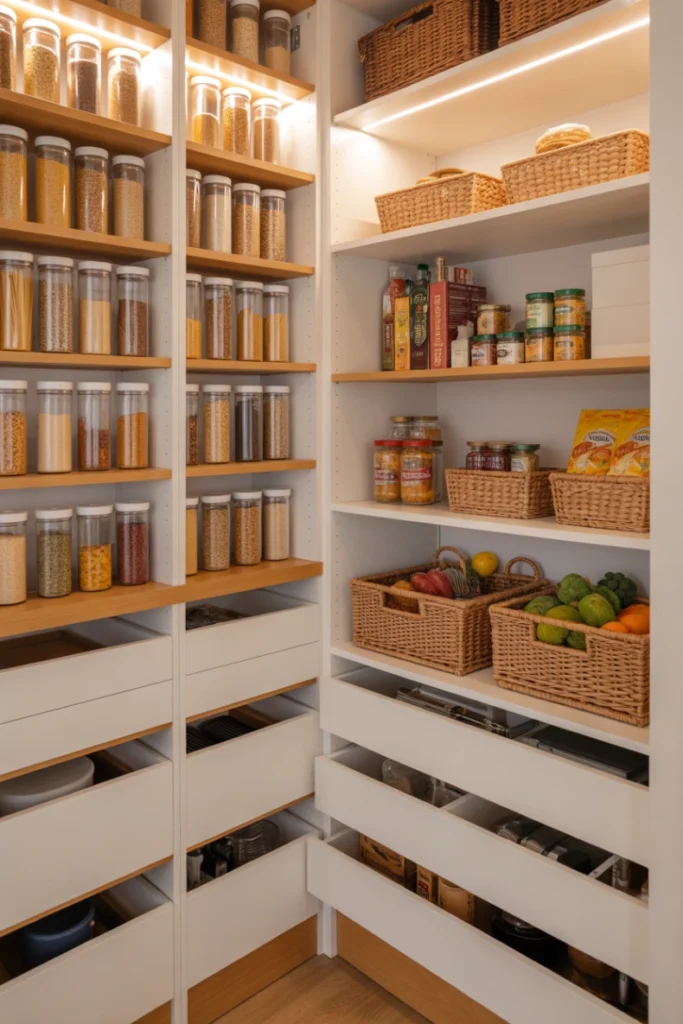 Combination shelving uses a mix of open shelves, drawers, baskets, and pull-out units to create a highly efficient pantry system. This approach allows you to tailor storage for different types of items, from dry goods to appliances.