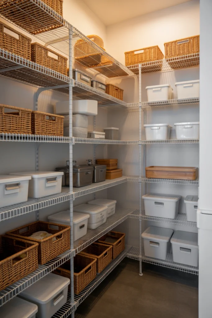 Although wire shelving is often associated with utility spaces, it can look stylish when paired with baskets, bins, and uniform containers. Using shelf liners and neutral storage accessories can soften the industrial look while maintaining the functional benefits of this shelving style.