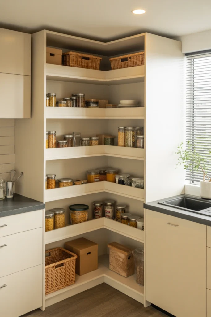 Corner pantry shelving is designed to make use of spaces that are often overlooked or difficult to access. By incorporating angled or curved shelves, you can turn awkward corners into efficient storage zones. This is especially useful in small kitchens where every inch counts.
