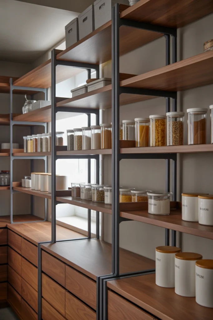 Functionally, industrial shelving provides excellent weight support and flexibility. It pairs well with labeled containers and neutral accessories to avoid visual clutter. This pantry shelving idea is perfect for homeowners who want a statement storage solution.
