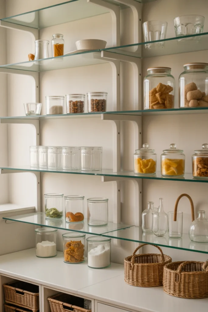 9. Glass Shelving for a Light and Airy Pantry