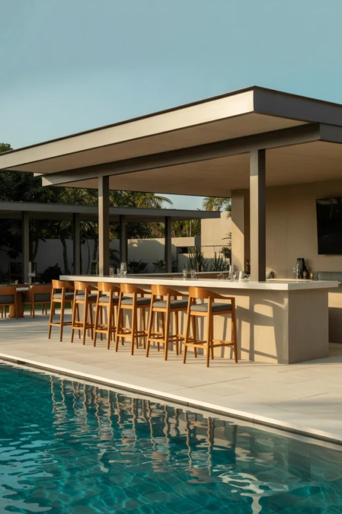 A pool pavilion with a bar adds a resort-style atmosphere to the backyard. This pool pavilion idea is perfect for socializing, offering a dedicated space for drinks and casual conversation. Bar counters, stools, refrigeration, and storage create a fully functional setup.