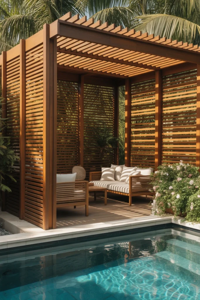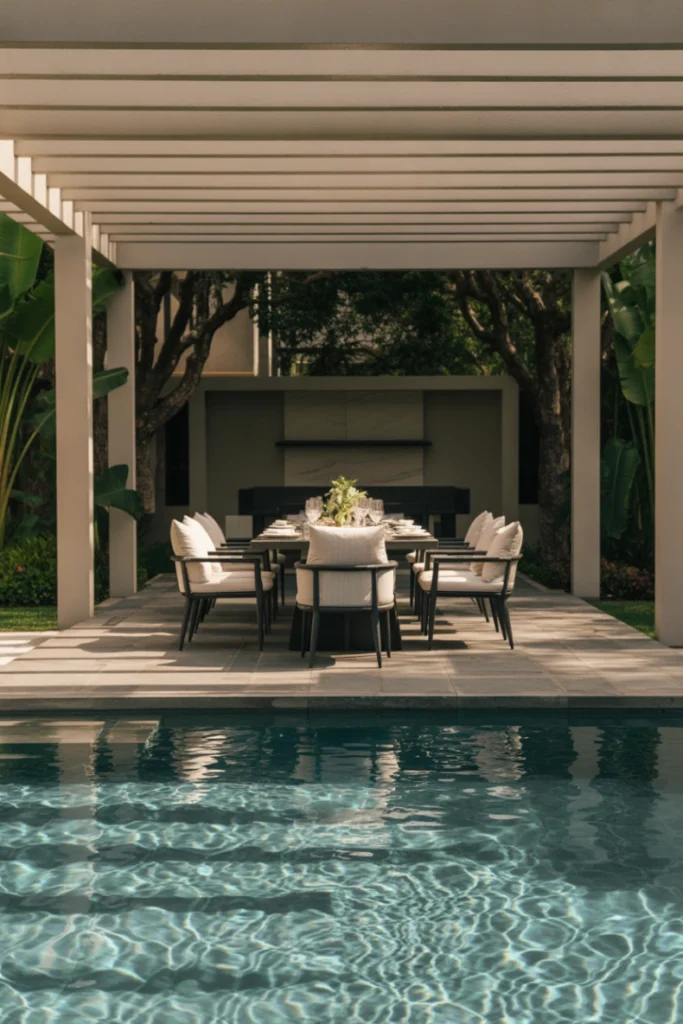Pergola-style pavilions provide partial shade while maintaining an open, airy feel. This is one of the most flexible pool pavilion ideas, allowing sunlight to filter through slatted or louvered roofs. Pergolas can be enhanced with fabric canopies or climbing plants for added shade.