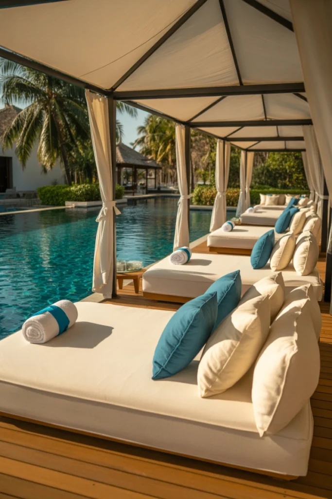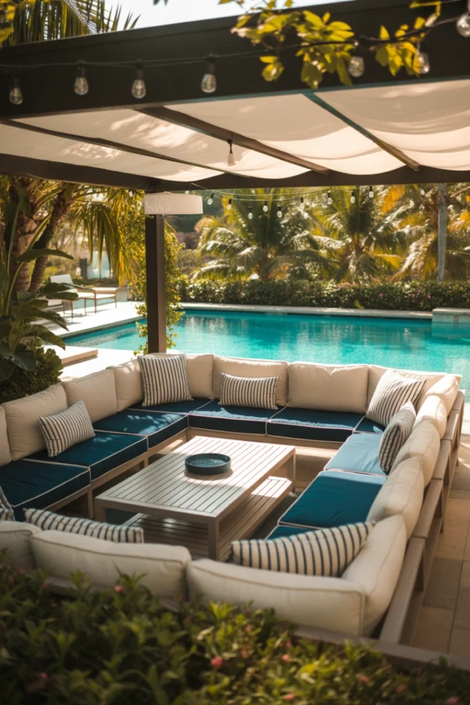 Soft cushions, flowing curtains, and adjustable shade elements add comfort and privacy. This design is ideal for homeowners who prioritize relaxation and want their pool area to feel like a private retreat.