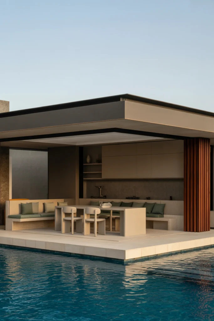From integrated kitchens and fireplaces to entertainment systems and custom furniture, luxury pavilions offer unmatched comfort and exclusivity. This design transforms the pool area into a statement space that enhances both daily living and property value.
