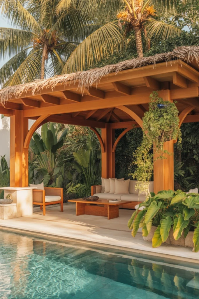 Tropical pool pavilion ideas draw inspiration from resort environments. Thatched roofs, natural wood, and lush greenery create a relaxed, vacation-like atmosphere. This design pairs well with freeform pools and abundant landscaping.